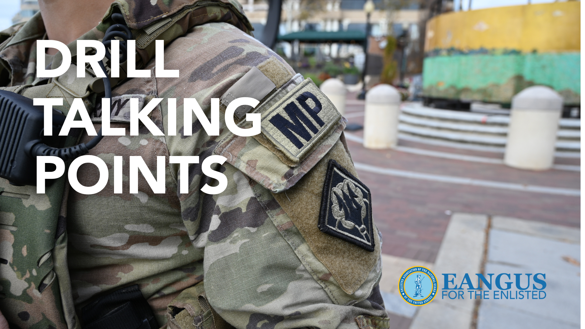 EANGUS supports No Tax on Drill Pay legislation introduced by Representative Andy Barr (R-KY) which would eliminate federal income taxes on Inactive Duty Training (IDT) pay earned during drill weekends. This would reduce the financial burden on Guard and Reserve members who already incur out-of-pocket costs to serve.